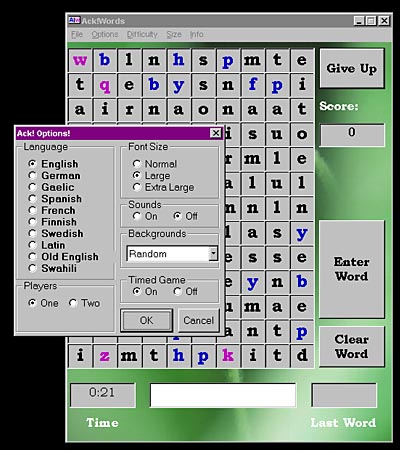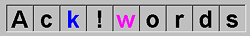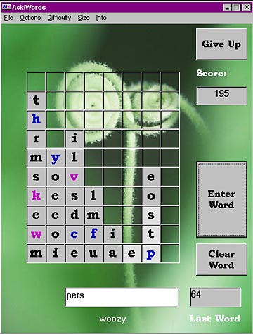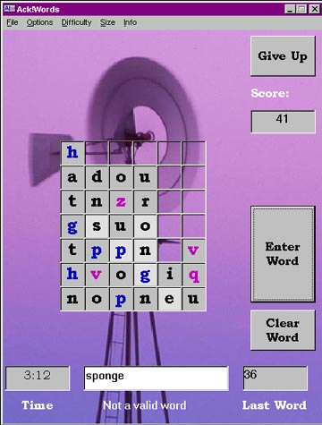 Ack!words is an new word/puzzle game that requires creativity, strategy, and good spelling. To play, you connect adjacent letters (in any direction) to each other to form words. When you find a word, the letters are removed from the board and the letters above fall down. The object is to make large words, using hard letters while unltimately clearing the board. It's actually harder than it sounds. To clear the board, it takes strategy to have the right mix of letters at the end to use them all up. Making high valued words requires planning to move the letters into position. Of course, creativity is always needed to see words in the jumble of letters. Version 2.1 has been released! (10-11-02) It includes a new mode of play and lots of new features. Download it today! |