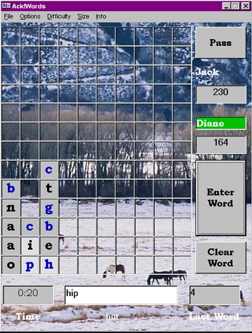 Ack!words is an new word/puzzle game that requires creativity, strategy, and good spelling. To play, you connect adjacent letters (in any direction) to each other to form words. When you find a word, the letters are removed from the board and the letters above fall down. The object is to make large words, using hard letters while unltimately clearing the board. It's actually harder than it sounds. To clear the board, it takes strategy to have the right mix of letters at the end to use them all up. Making high valued words requires planning to move the letters into position. Of course, creativity is always needed to see words in the jumble of letters. Version 2.1 has been released! (10-11-02) It includes a new mode of play and lots of new features. Download it today! |